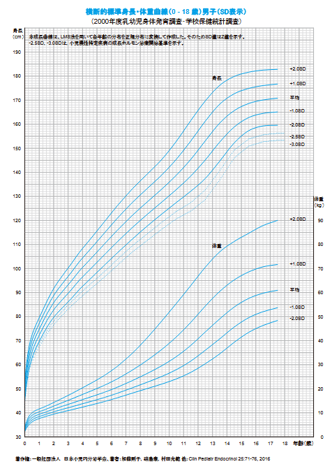成長曲線とは男女別にたくさんのお子さんの身長や体重の記録を集めて、年齢別に身長や体重の平均値や標準偏差を曲線で示した表のことです。同じ年齢のたくさんのお子さんの身長を測ると、その計測値は、平均値を中心に正規分布になることが知られています。